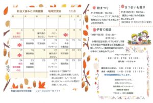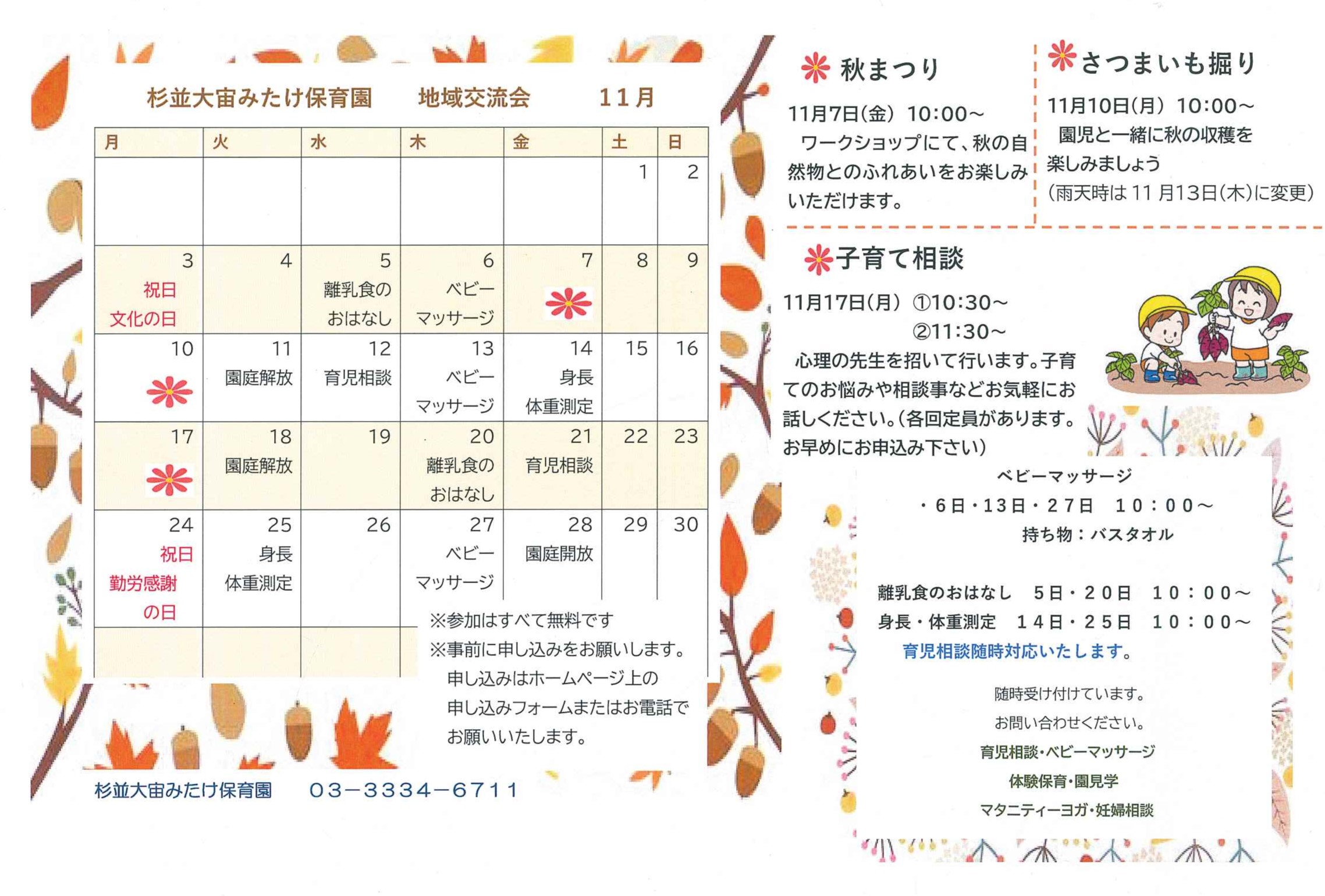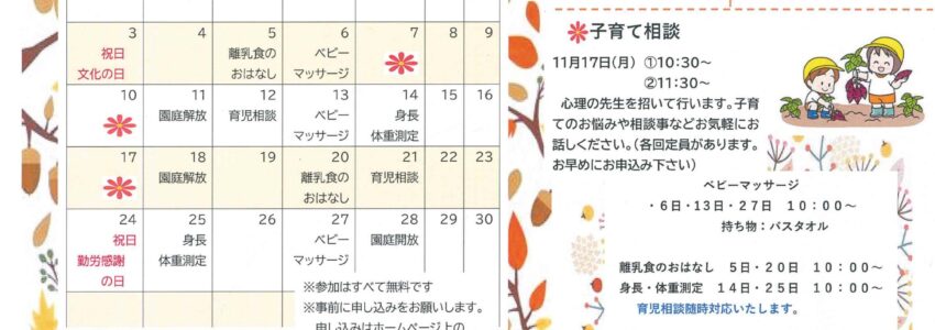 地域交流会 11月のご案内 2025 / 10 / 23 みたけからのお知らせ, みたけの活動 目次 - シェア いよいよ秋らしくなり、園庭遊びや散歩も楽しい季節です。園見学、体験保育のお申込みもお待ちしています。 人気のベビーマッサージ等を体験いただきたく思います。 お申込みをお待ちしています。 申し込みフォーム – Google フォーム 子育て支援(地域交流) Tag : ベビーマッサージ, 子育て支援 作成者 : 杉並大宙みたけ保育園 « 人気のベビーマッサージ 10月も開催します